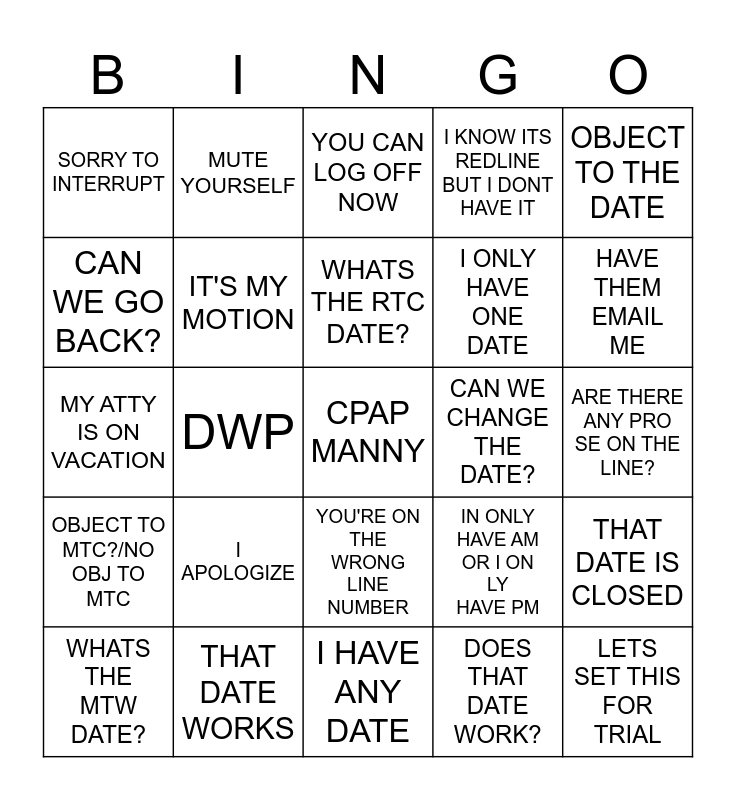 This bingo card has a free space and 24 words: I APOLOGIZE, THAT DATE WORKS, WHATS THE RTC DATE?, WHATS THE MTW DATE?, OBJECT TO THE DATE, SORRY TO INTERRUPT, CAN WE GO BACK?, MUTE YOURSELF, CAN WE CHANGE THE DATE?, YOU'RE ON THE WRONG LINE NUMBER, I ONLY HAVE ONE DATE, MY ATTY IS ON VACATION, IN ONLY HAVE AM OR I ONLY HAVE PM, THAT DATE IS CLOSED, IT'S MY MOTION, DOES THAT DATE WORK?, ARE THERE ANY PRO SE ON THE LINE?, YOU CAN LOG OFF NOW, HAVE THEM EMAIL ME, DWP, LETS SET THIS FOR TRIAL, OBJECT TO MTC?/NO OBJ TO MTC, I KNOW ITS REDLINE BUT I DONT HAVE IT and I HAVE ANY DATE.
