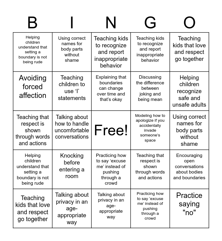 This bingo card has a free space and 48 words: Respecting when someone says "no", Practice saying "no", Giving children choices, Talking about privacy in an age-appropriate way, Knocking before entering a room, Asking before hugging someone, Using correct names for body parts without shame, Letting children know they can always talk to a trusted adult, Avoiding forced affection, Correcting myths like ‘boys don’t cry’ or ‘girls must be polite’, Teaching children to use ‘I’ statements, Teaching kids to recognize and report inappropriate behavior, Encouraging open conversations about bodies and boundaries, Teaching that respect is shown through words and actions, Explaining that different people have different comfort levels with touch, Respecting when a child does not want to be tickled, Explaining that boundaries can change over time and that’s okay, Modeling how to apologize if you accidentally invade someone’s space, Helping children recognize safe and unsafe adults, Teaching kids that love and respect go together, Talking about how to handle uncomfortable conversations, Practicing how to say ‘excuse me’ instead of pushing through a crowd, Helping children understand that setting a boundary is not being rude, Discussing the difference between joking and being mean, Modeling how to apologize if you accidentally invade someone’s space, Helping children recognize safe and unsafe adults, Teaching kids that love and respect go together, Talking about how to handle uncomfortable conversations, Practicing how to say ‘excuse me’ instead of pushing through a crowd, Helping children understand that setting a boundary is not being rude, Discussing the difference between joking and being mean, Respecting when someone says "no", Practice saying "no", Giving children choices, Talking about privacy in an age-appropriate way, Knocking before entering a room, Asking before hugging someone, Using correct names for body parts without shame, Letting children know they can always talk to a trusted adult, Avoiding forced affection, Correcting myths like ‘boys don’t cry’ or ‘girls must be polite’, Teaching children to use ‘I’ statements, Teaching kids to recognize and report inappropriate behavior, Encouraging open conversations about bodies and boundaries, Teaching that respect is shown through words and actions, Explaining that different people have different comfort levels with touch, Respecting when a child does not want to be tickled and Explaining that boundaries can change over time and that’s okay.