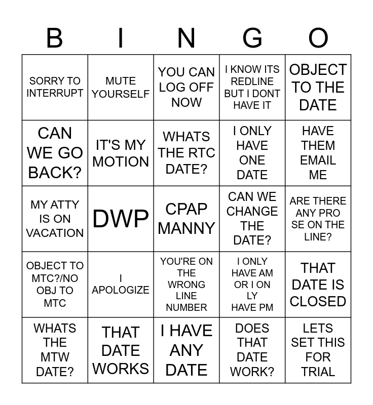 This bingo card has a free space and 24 words: I APOLOGIZE, THAT DATE WORKS, WHATS THE RTC DATE?, WHATS THE MTW DATE?, OBJECT TO THE DATE, SORRY TO INTERRUPT, CAN WE GO BACK?, MUTE YOURSELF, CAN WE CHANGE THE DATE?, YOU'RE ON THE WRONG LINE NUMBER, I ONLY HAVE ONE DATE, MY ATTY IS ON VACATION, I ONLY HAVE AM OR I ONLY HAVE PM, THAT DATE IS CLOSED, IT'S MY MOTION, DOES THAT DATE WORK?, ARE THERE ANY PRO SE ON THE LINE?, YOU CAN LOG OFF NOW, HAVE THEM EMAIL ME, DWP, LETS SET THIS FOR TRIAL, OBJECT TO MTC?/NO OBJ TO MTC, I KNOW ITS REDLINE BUT I DONT HAVE IT and I HAVE ANY DATE.