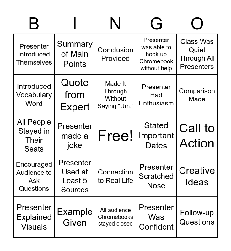 This bingo card has a free space and 24 words: Presenter Used at Least 5 Sources, Example Given, Made It Through Without Saying “Um.”, Presenter Explained Visuals, Class Was Quiet Through All Presenters, Presenter Introduced Themselves, Introduced Vocabulary Word, Summary of Main Points, Stated Important Dates, Connection to Real Life, Presenter Had Enthusiasm, All People Stayed in Their Seats, Presenter Scratched Nose, Creative Ideas, Quote from Expert, Presenter Was Confident, Call to Action, Conclusion Provided, Comparison Made, Presenter made a joke, Follow-up Questions, Encouraged Audience to Ask Questions, Presenter was able to hook up Chromebook without help and All audience Chromebooks stayed closed.