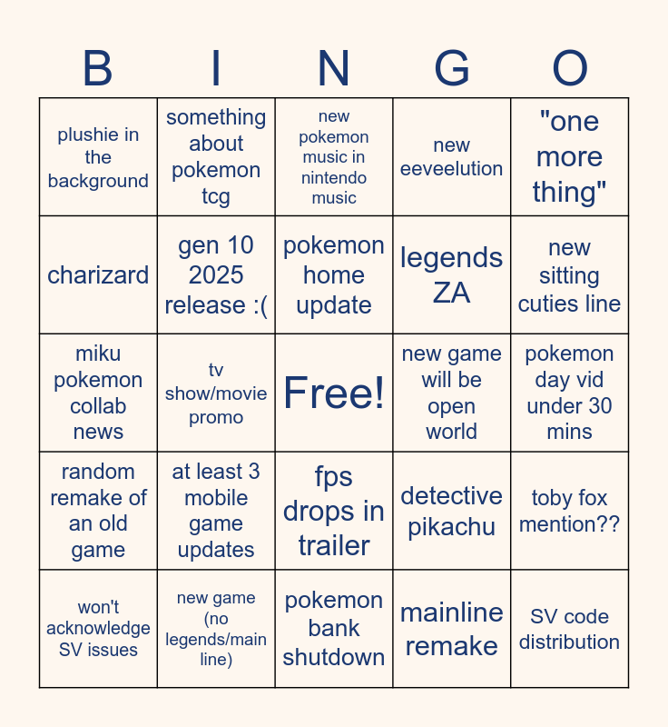 This bingo card has a free space and 24 words: at least 3 mobile game updates, new game (no legends/main line), pokemon home update, won't acknowledge SV issues, "one more thing", plushie in the background, charizard, something about pokemon tcg, new game will be open world, fps drops in trailer, legends ZA, miku pokemon collab news, detective pikachu, toby fox mention??, gen 10 2025 release :(, mainline remake, pokemon day vid under 30 mins, new pokemon music in nintendo music, new sitting cuties line, tv show/movie promo, SV code distribution, random remake of an old game, new eeveelution and pokemon bank shutdown.