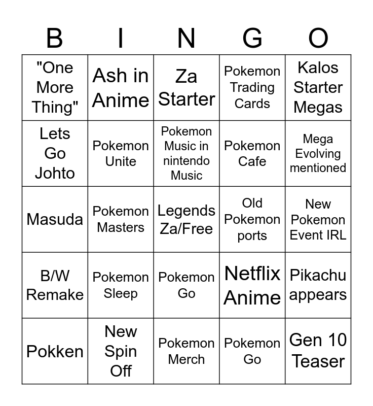 This bingo card has a free space and 24 words: Pokemon Sleep, New Spin Off, Pokemon Music in nintendo Music, Pokken, Kalos Starter Megas, "One More Thing", Lets Go Johto, Ash in Anime, Old Pokemon ports, Pokemon Go, Pokemon Cafe, Masuda, Netflix Anime, Pikachu appears, Pokemon Unite, Pokemon Go, New Pokemon Event IRL, Za Starter, Mega Evolving mentioned, Pokemon Masters, Gen 10 Teaser, B/W Remake, Pokemon Trading Cards and Pokemon Merch.