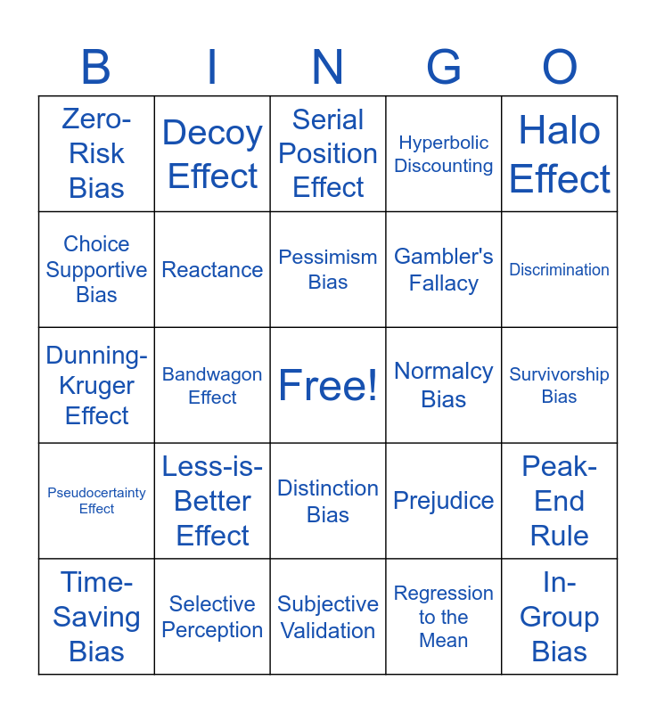 This bingo card has a free space and 75 words: Availability Heuristic, Recency Bias, Serial Position Effect, Misinformation Effect, Source Amnesia, Confirmation Bias, Anchoring Bias, Framing Effect, Loss Aversion, Sunk Cost Fallacy, Overconfidence Bias, Optimism Bias, Pessimism Bias, Choice Supportive Bias, Status Quo Bias, Bandwagon Effect, Authority Bias, In-Group Bias, Out-Group Homogeneity Bias, Halo Effect, Horn Effect, Dunning-Kruger Effect, Reactance, Decoy Effect, Hyperbolic Discounting, Fundamental Attribution Error, Just-World Hypothesis, Self-Serving Bias, Actor-Observer Bias, Groupthink, Bystander Effect, Social Proof, Stereotyping, Prejudice, Discrimination, Gambler's Fallacy, Base Rate Fallacy, Clustering Illusion, Survivorship Bias, Regression to the Mean, Automation Bias, Information Bias, Planning Fallacy, Pro-innovation Bias, Restraint Bias, Risk Compensation, Time-Saving Bias, Zero-Risk Bias, Ambiguity Effect, Rhyme as Reason Effect, Conservatism Bias, Distinction Bias, Endowment Effect, Frequency Illusion, Identifiable Victim Effect, Illusion of Control, Illusion of Validity, Impact Bias, IKEA Effect, Irrational Escalation, Less-is-Better Effect, Mere Exposure Effect, Money Illusion, Moral Credentialing, Neglect of Probability, Normalcy Bias, Omission Bias, Outcome Bias, Parkinson's Law, Peak-End Rule, Pseudocertainty Effect, Selective Perception, Semmelweis Reflex, Subjective Validation and Zero-Sum Bias.