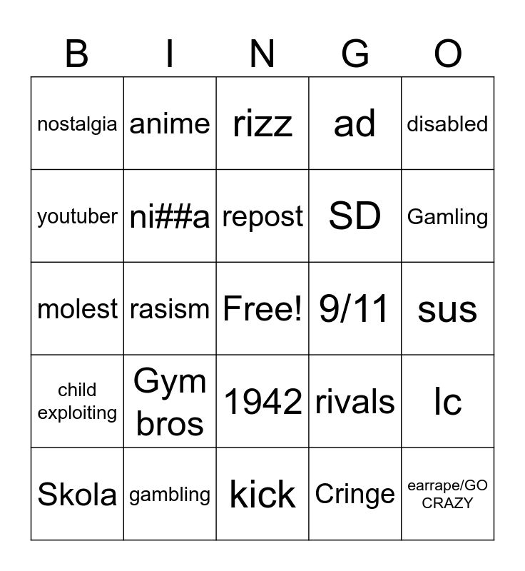 This bingo card has a free space and 24 words: Skola, Gym bros, repost, Cringe, disabled, nostalgia, anime, rizz, 9/11, sus, molest, ni##a, rivals, lc, youtuber, gambling, kick, ad, Gamling, child exploiting, rasism, 1942, SD and earrape/GO CRAZY.