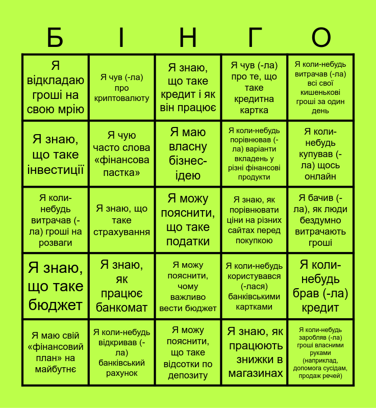 This bingo card has 25 words: Я знаю, що таке бюджет, Я коли-небудь відкривав (-ла) банківський рахунок, Я можу пояснити, що таке податки, Я знаю, як працюють знижки в магазинах, Я коли-небудь витрачав (-ла) всі свої кишенькові гроші за один день, Я відкладаю гроші на свою мрію, Я чув (-ла) про криптовалюту, Я знаю, що таке кредит і як він працює, Я знаю, як порівнювати ціни на різних сайтах перед покупкою, Я коли-небудь брав (-ла) кредит, Я знаю, що таке інвестиції, Я чую часто слова «фінансова пастка», Я можу пояснити, що таке відсотки по депозиту, Я коли-небудь користувався (-лася) банківськими картками, Я коли-небудь купував (-ла) щось онлайн, Я маю свій «фінансовий план» на майбутнє, Я знаю, що таке страхування, Я маю власну бізнес-ідею, Я коли-небудь порівнював (-ла) варіанти вкладень у різні фінансові продукти, Я бачив (-ла), як люди бездумно витрачають гроші, Я коли-небудь витрачав (-ла) гроші на розваги, Я знаю, як працює банкомат, Я можу пояснити, чому важливо вести бюджет, Я чув (-ла) про те, що таке кредитна картка and Я коли-небудь заробляв (-ла) гроші власними руками (наприклад, допомога сусідам, продаж речей).