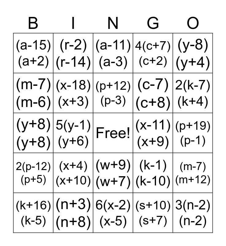 This bingo card has a free space and 24 words: (x+4)(x+10), (n+3)(n+8), (p+12)(p-3), (k+16)(k-5), (y-8)(y+4), (a-15)(a+2), (m-7)(m-6), (r-2)(r-14), (x-11)(x+9), (w+9)(w+7), (c-7)(c+8), (y+8)(y+8), (k-1)(k-10), (m-7)(m+12), (x-18)(x+3), (s+10)(s+7), (p+19)(p-1), (a-11)(a-3), 2(k-7)(k+4), 5(y-1)(y+6), 3(n-2)(n-2), 2(p-12)(p+5), 4(c+7)(c+2) and 6(x-2)(x-5).