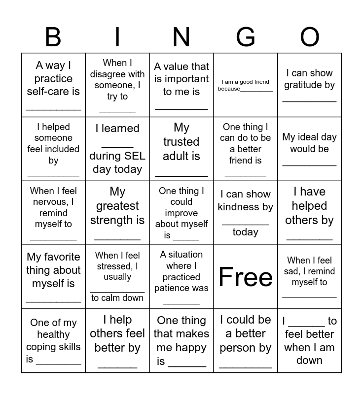This bingo card has 25 words: When I feel stressed, I usually ___________ to calm down, One thing that makes me happy is ______, My trusted adult is ________, One of my healthy coping skills is ________, I can show gratitude by __________, A way I practice self-care is _________, I helped someone feel included by __________, When I disagree with someone, I try to _______, I can show kindness by ________ today, A situation where I practiced patience was _______, One thing I can do to be a better friend is ________, When I feel nervous, I remind myself to _________, Free, When I feel sad, I remind myself to ___________, I learned _____ during SEL day today, I ______ to feel better when I am down, I have helped others by _______, A value that is important to me is _________, My ideal day would be __________, My greatest strength is _______, One thing I could improve about myself is _____, I help others feel better by ______, My favorite thing about myself is _________, I am a good friend because__________ and I could be a better person by ________.