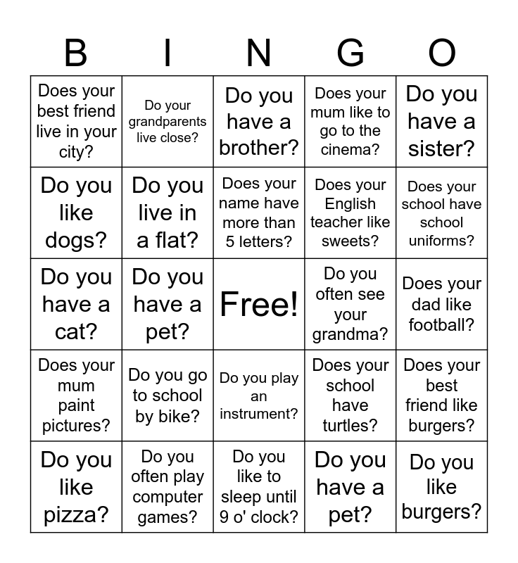 This bingo card has a free space and 29 words: Do you like pizza?, Does your mum have a sister?, Do you have a pet?, Do you play the piano?, Does your best friend live in your city?, Do you have a brother?, Do you live in a flat?, Do you go to school by bike?, Do you often see your grandma?, Do you often play computer games?, Does your dad like football?, Do you like burgers?, Do you like to sleep until 9 o' clock?, Do you have a pet?, Does your school have school uniforms?, Do you and your family often have picnics?, Do you play an instrument?, Does your mum paint pictures?, Do you have a sister?, Do you have a cat?, Does your school have turtles?, Does your favourite teacher give you homework?, Does your English teacher like sweets?, Do you like dogs?, Does your mum like to go to the cinema?, Do your grandparents live close?, Does your best friend like burgers?, Does your name have more than 5 letters? and Does your name have less than 6 letters?.