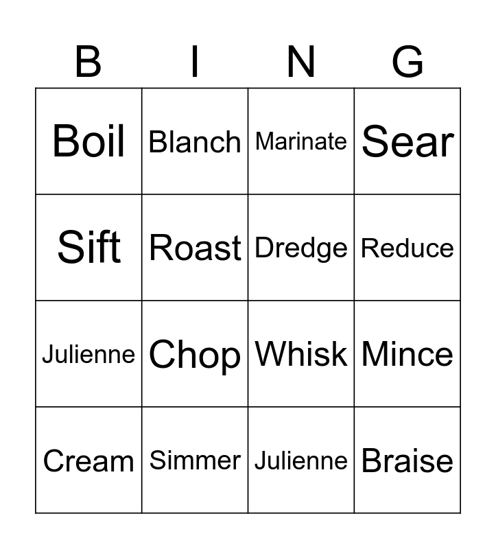This bingo card has 20 words: Mince, Dice, Marinate, Steam, Cream, Sift, Simmer, Boil, Julienne, Blanch, Chop, Whisk, Roast, Braise, Dredge, Carmelize, Reduce, Sear, Julienne and Dice.