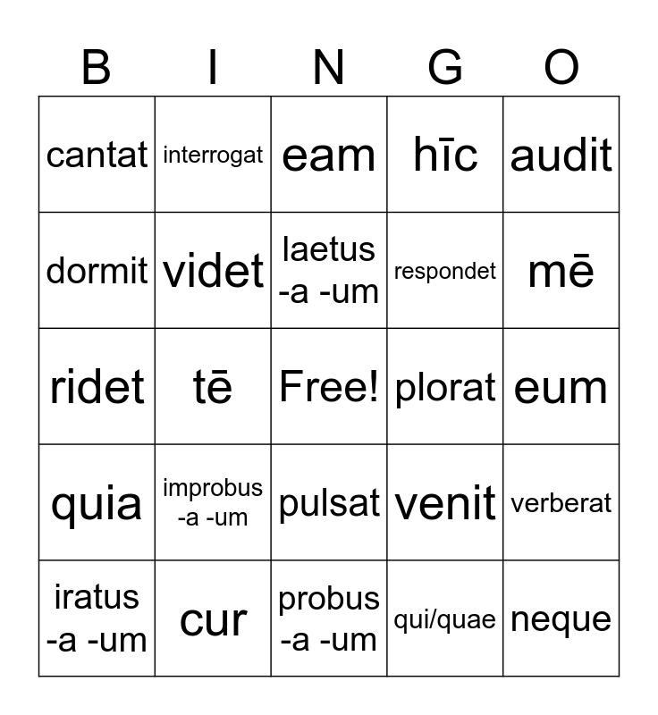 This bingo card has a free space and 25 words: improbus -a -um, probus -a -um, laetus -a -um, iratus -a -um, audit, cantat, dormit, interrogat, plorat, pulsat, respondet, ridet, venit, verberat, videt, vocat, eum, eam, mē, tē, neque, cur, quia, hīc and qui/quae.