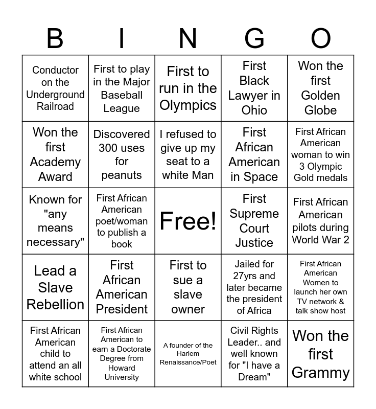 This bingo card has a free space and 24 words: First African American child to attend an all white school, First African American President, I refused to give up my seat to a white Man, Civil Rights Leader.. and well known for "I have a Dream", Won the first Golden Globe, Conductor on the Underground Railroad, First to play in the Major Baseball League, First to run in the Olympics, First Supreme Court Justice, First African American pilots during World War 2, Known for "any means necessary", Discovered 300 uses for peanuts, Jailed for 27yrs and later became the president of Africa, First African American Women to launch her own TV network & talk show host, Won the first Academy Award, First African American to earn a Doctorate Degree from Howard University, A founder of the Harlem Renaissance/Poet, First Black Lawyer in Ohio, First African American woman to win 3 Olympic Gold medals, Lead a Slave Rebellion, First African American poet/woman to publish a book, First to sue a slave owner, First African American in Space and Won the first Grammy.