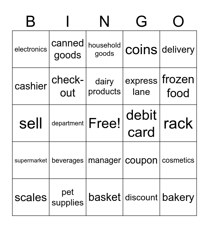 This bingo card has a free space and 50 words: aisle, bakery, barcode, basket, beverages, buy, canned goods, cart, cashier, change, check-out, coins, cosmetics, coupon, credit card, customer, dairy products, debit card, delicatessen, delivery, department, discount, electronics, express lane, freezer, fresh flowers, frozen food, guarantee, household goods, manager, meat, mini-market, on sale, packaging, pet supplies, pharmacy, price, produce, purchase, rack, receipt, refund, return policy, sales tax, scales, sell, shelf, shop, supermarket and supervisor.