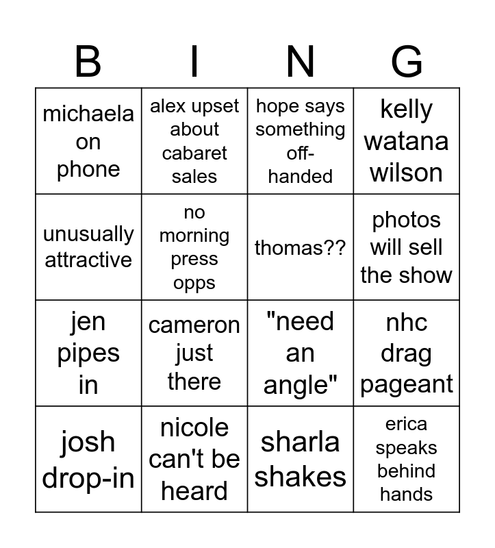 This bingo card has 16 words: nicole can't be heard, nhc drag pageant, hope says something off-handed, michaela on phone, jen pipes in, alex upset about cabaret sales, "need an angle", sharla shakes, unusually attractive, no morning press opps, josh drop-in, kelly watana wilson, cameron just there, photos will sell the show, thomas?? and erica speaks behind hands.