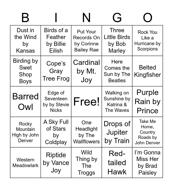 This bingo card has a free space and 63 words: Fishin' in the Dark by Nitty Gritty Dirt Band, Red Dirt Road by Brooks & Dunn, Where the Green Grass Grows by Tim McGraw, Take Me Home, Country Roads by John Denver, Numb Little Bug by Em Beihold, Dancing in the Moonlight by King Harvest, Birds of a Feather by Billie Eilish, Wildflowers by Trampled by Turtles, Cardinal by Mt. Joy, Heat Waves by Glass Animals, One Headlight by The Wallflowers, Free Bird by Lynyrd Skynyrd, Purple Rain by Prince, Rock You Like a Hurricane by Scorpions, The Reaper by Blue Oyster Cult, Birding by Swet Shop Boys, Edge of Seventeen by by Stevie Nicks, Dust in the Wind by Kansas, Ocean Eyes by Billie Eilish, Here Comes the Sun by The Beatles, A Sky Full of Stars by Coldplay, Rocky Mountain High by John Denver, Three Little Birds by Bob Marley, Fireflies by Owl City, Barracuda by Heart, Day'N'Nite by Kid Cudi, Do I Wanna Know? by Artic Monkeys, Shake the Frost by Tyler Childers, Dandelion by Oliver Hazard, Never Better by Wild Rivers, Northern Cardinal, Rose-breasted Grosbeak, Whip-poor-will, Northern Flicker, Belted Kingfisher, Western Meadowlark, American Toad, Red-tailed Hawk, Field Sparrow, Cope’s Gray Tree Frog, Barred Owl, Walking on Sunshine by Katrina & The Waves, Pontoon by Little Big Town, Thunder by Imagine Dragons, I’m Gonna Miss Her by Brad Paisley, Riptide by Vance Joy, Sunroof by Nicky Youre, hey daisy, Drops of Jupiter by Train, Gravity by John Mayer, Wildflowers by Tom Petty, Knee Deep by Zac Brown Band, Jimmy Buffett, Wild Thing by The Troggs, Constellations by Jack Johnson, Greater Prairie Chicken, What A Wonderful World by Louis Armstrong, Put Your Records On by Corinne Bailey Rae, Dog-Day Cicada, The Lion Sleeps Tonight by The Tokens, American Kestrel, Landslide by Fleetwood Mac, Sunflower by Post Malone, Swae Lee, Ends of the Earth by Lord Huron and Snow on the Beach by Taylor Swift, Lana Del Rey.