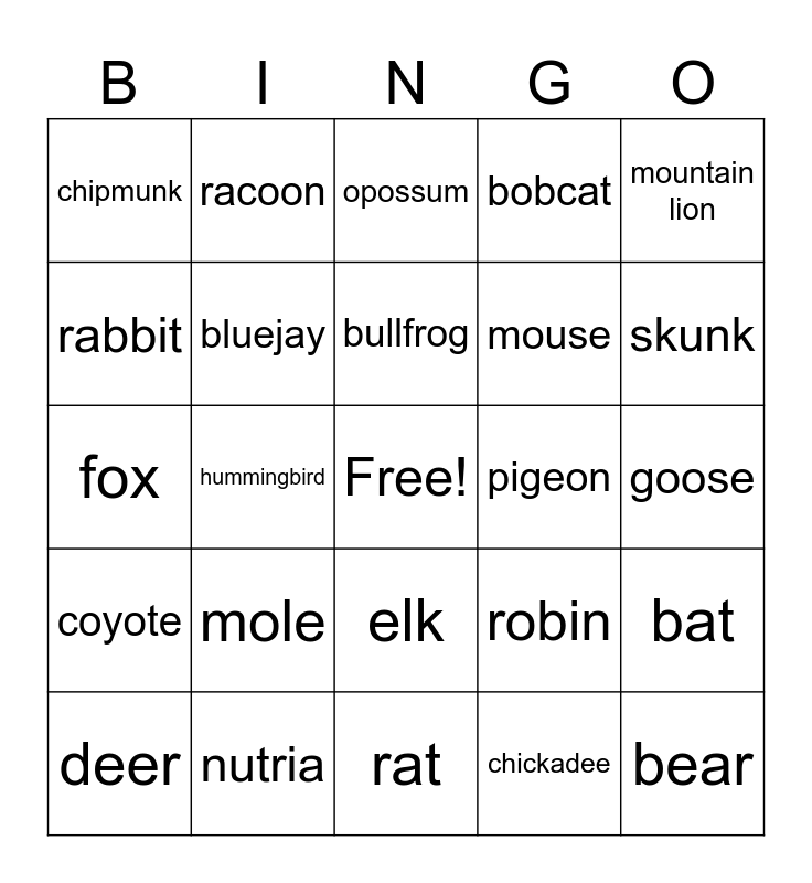 This bingo card has a free space and 27 words: robin, squirrel, mouse, rat, rabbit, opossum, racoon, coyote, pigeon, bat, fox, bobcat, deer, nutria, skunk, crow, bluejay, bullfrog, mole, chipmunk, goose, chickadee, hummingbird, bear, elk, mountain lion and beaver.