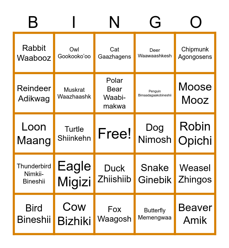 This bingo card has a free space and 44 words: Bear Makwa, Beaver Amik, Bee Aamoo, Bird Bineshii, Bobcat Gidagaa-bizhiw, Butterfly Memengwaa, Cat Gaazhagens, Chicken Baaka’aakwe, Chipmunk Agongosens, Cow Bizhiki, Deer Waawaashkesh, Dog Nimosh, Duck Zhiishiib, Eagle Migizi, Fish Giigoohn, Fox Waagosh, Frog Omakakii, Loon Maang, Minnow Giigoozens, Moose Mooz, Owl Gookooko’oo, Pig Gookoosh, Porcupine Gaag, Rabbit Waabooz, Raccoon Esiban, Robin Opichi, Skunk Zhigaag, Squirrel Ajidamoo, Snake Ginebik, Thunderbird Nimkii-Bineshii, Turkey Mizise, Weasel Zhingos, Wolf Ma’iingan, Caterpillar Moosehn, Turtle Shiinkehn, Wolverine Gwiingwa'aage, Lion/Panther Mishibizhii, Monkey D’maakimeshii, Polar Bear Waabi-makwa, Reindeer Adikwag, Penguin Bimaadagaakobineshii, Otter Nigig, Muskrat Waazhaashk and Waabiginoojiihn Mouse.