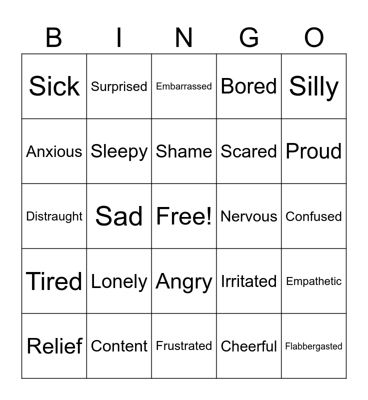 This bingo card has a free space and 30 words: Content, Happy, Sad, Excited, Sick, Embarrassed, Sleepy, Angry, Nervous, Frustrated, Confused, Flabbergasted, Cheerful, Funny, Proud, Annoyed, Irritated, Tired, Lonely, Silly, Distraught, Hurt, Surprised, Scared, Anxious, Bored, Empathetic, Relief, Shame and Love.