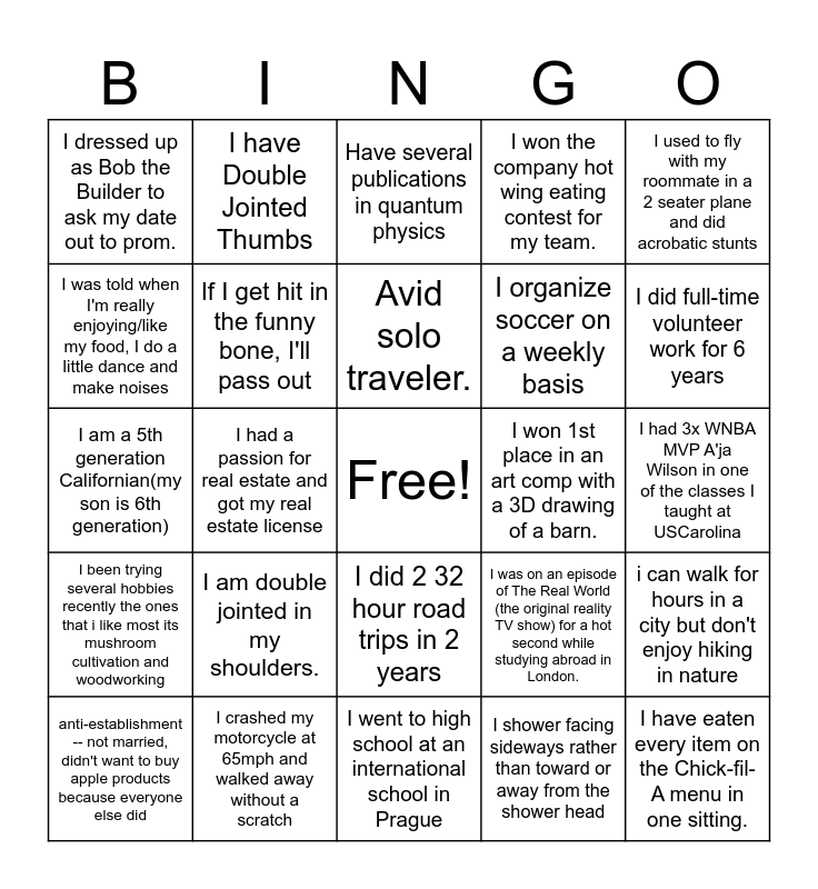 This bingo card has a free space and 42 words: I broke a rib learning to surf in costa rica., Avid solo traveler., I've sat on the Iron Throne., I am double jointed in my shoulders., I shower facing sideways rather than toward or away from the shower head, i can walk for hours in a city but don't enjoy hiking in nature, I have eaten every item on the Chick-fil-A menu in one sitting., When im not working, Im a dateline junkie, Have several publications in quantum physics, I did 2 32 hour road trips in 2 years, I had 3x WNBA MVP A'ja Wilson in one of the classes I taught at USCarolina, I did full-time volunteer work for 6 years, I had a passion for real estate and got my real estate license, I used to fly with my roommate in a 2 seater plane and did acrobatic stunts, I'm coding my own video game., I was on an episode of The Real World (the original reality TV show) for a hot second while studying abroad in London., I have over 100 cousins on my dads side of the family and a decent chunk live on a compound together., I am a 5th generation Californian(my son is 6th generation), My neighborhood likes throwing tiktok themed girls nights, I have Double Jointed Thumbs, I was told when I'm really enjoying/like my food, I do a little dance and make noises, I am a stand-up comedian, I owned a tarantula in my alma mater colors., I dressed up as Bob the Builder to ask my date out to prom., I can make the shape of a clover with my tongue., I was born in Atlanta GA, I organize soccer on a weekly basis, I went to Stagecoach before it was cool, I have been ranked in the top 500 in the world in online Catan., I've had at least 8 beta fish in my life and they were all named Bob Marley, My current hobby is Junk Journaling, I been trying several hobbies recently the ones that i like most its mushroom cultivation and woodworking, If I get hit in the funny bone, I'll pass out, I went to high school at an international school in Prague, This will be my first time in Texas, despite loving travel. I've been to 15 different countries., anti-establishment -- not married, didn't want to buy apple products because everyone else did, I crashed my motorcycle at 65mph and walked away without a scratch, I won 1st place in an art comp with a 3D drawing of a barn., eaten meat of 34 animals excluding seafood, My frenchie is my child, I won the company hot wing eating contest for my team. and Received the award for "Most Considerate Boy" in 3rd grade..