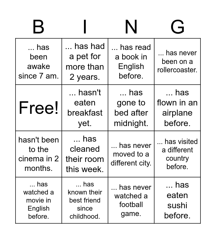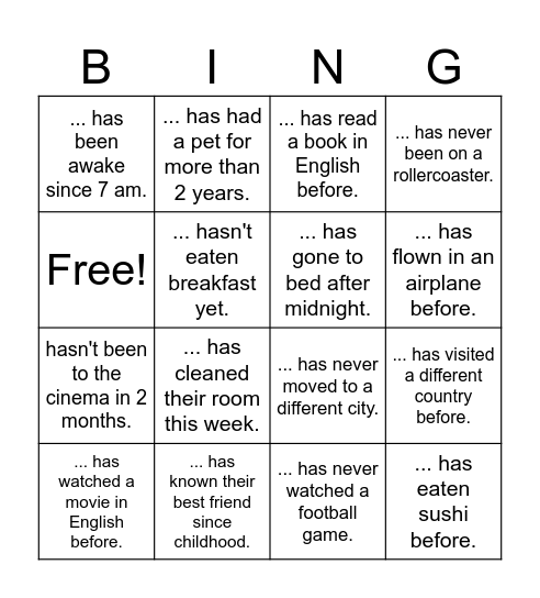 This bingo card has 16 words: ... has known their best friend since childhood., ... has visited a different country before., ... has read a book in English before., ... has been awake since 7 am., hasn't been to the cinema in 2 months., ... has had a pet for more than 2 years., ... has never moved to a different city., ... has never watched a football game., Free!, ... hasn't eaten breakfast yet., ... has watched a movie in English before., ... has never been on a rollercoaster., ... has cleaned their room this week., ... has flown in an airplane before., ... has gone to bed after midnight. and ... has eaten sushi before..