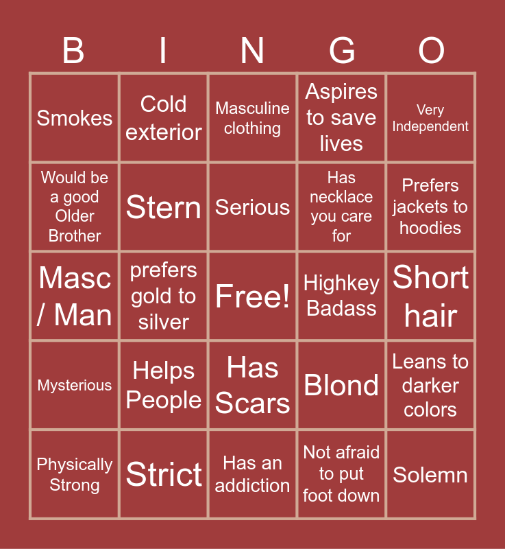 This bingo card has a free space and 24 words: Helps People, Strict, Serious, Physically Strong, Very Independent, Smokes, Would be a good Older Brother, Cold exterior, Highkey Badass, Has Scars, Has necklace you care for, Masc / Man, Blond, Leans to darker colors, Stern, Not afraid to put foot down, Short hair, Masculine clothing, Prefers jackets to hoodies, prefers gold to silver, Solemn, Mysterious, Aspires to save lives and Has an addiction.
