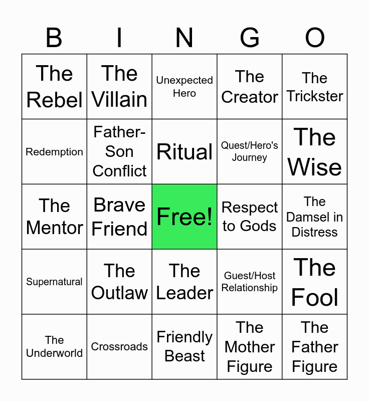 This bingo card has a free space and 42 words: The Male Hero, Ritual, Rebirth, The Outlaw, The Mother Figure, The Fool, The Father Figure, The Innocent, Unexpected Hero, The Leader, The Damsel in Distress, The Wise, Brave Friend, The Trickster, The Underdog, Guest/Host Relationship, Crime and Punishment, The Mentor, Respect for the Dead, The Villain, Redemption, The Comedy Sidekick, The Traitor, The Rebel, Light vs Darkness, Star-Crossed Lovers, Quest/Hero's Journey, Numbers, Destiny/Prophecy, Magic Weapon, Natural Elements, Supernatural, Father-Son Conflict, Friendly Beast, The Monster, The Underworld, Crossroads, Respect to Gods, The Everyman, The Innocent, The Creator and The Caregiver.