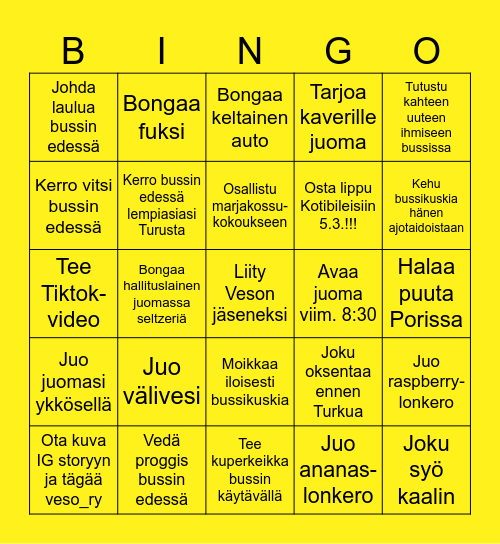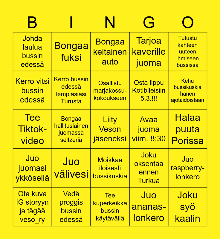 This bingo card has a free space and 24 words: Juo välivesi, Vedä proggis bussin edessä, Osallistu marjakossu- kokoukseen, Ota kuva IG storyyn ja tägää veso_ry, Tutustu kahteen uuteen ihmiseen bussissa, Johda laulua bussin edessä, Kerro vitsi bussin edessä, Bongaa fuksi, Avaa juoma viim. 8:30, Moikkaa iloisesti bussikuskia, Osta lippu Kotibileisiin 5.3.!!!, Tee Tiktok-video, Joku oksentaa ennen Turkua, Juo raspberry-lonkero, Kerro bussin edessä lempiasiasi Turusta, Juo ananas-lonkero, Halaa puuta Porissa, Bongaa keltainen auto, Kehu bussikuskia hänen ajotaidoistaan, Bongaa hallituslainen juomassa seltzeriä, Joku syö kaalin, Juo juomasi ykkösellä, Tarjoa kaverille juoma and Tee kuperkeikka bussin käytävällä.
