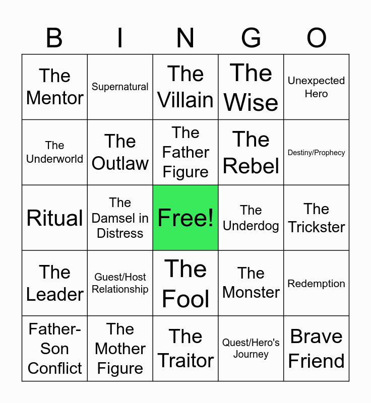 This bingo card has a free space and 41 words: The Male Hero, Ritual, Rebirth, The Outlaw, The Mother Figure, The Fool, The Father Figure, The Innocent, Unexpected Hero, The Leader, The Damsel in Distress, The Wise, Brave Friend, The Trickster, The Underdog, Guest/Host Relationship, Crime and Punishment, The Mentor, Respect for the Dead, The Villain, Redemption, The Comedy Sidekick, The Traitor, The Rebel, Light vs Darkness, Star-Crossed Lovers, Quest/Hero's Journey, Numbers, Destiny/Prophecy, Magic Weapon, Natural Elements, Supernatural, Father-Son Conflict, Friendly Beast, The Monster, The Underworld, Crossroads, Respect to Gods, The Everyman, The Creator and The Caregiver.