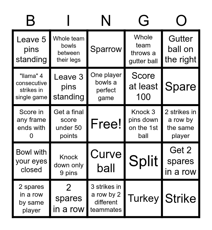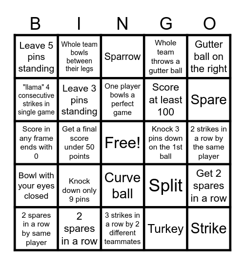 This bingo card has a free space and 29 words: 2 spares in a row by same player, Sing a song while bowling, Get a final score under 50 points, Compliment another team, Leave 5 pins standing, Sparrow, Leave 3 pins standing, Knock down only 9 pins, Knock 3 pins down on the 1st ball, 2 spares in a row, 2 strikes in a row by the same player, Strike, 3 strikes in a row by 2 different teammates, Turkey, Spare, Steener, Curve ball, Bowl with your eyes closed, Gutter ball on the right, Score in any frame ends with 0, Split, Bowl a granny and get a strike, Score at least 100, "llama" 4 consecutive strikes in single game, Whole team throws a gutter ball, Whole team bowls between their legs, Get 2 spares in a row, One player bowls a perfect game and One member bowls a turkey (3 strikes in a row).