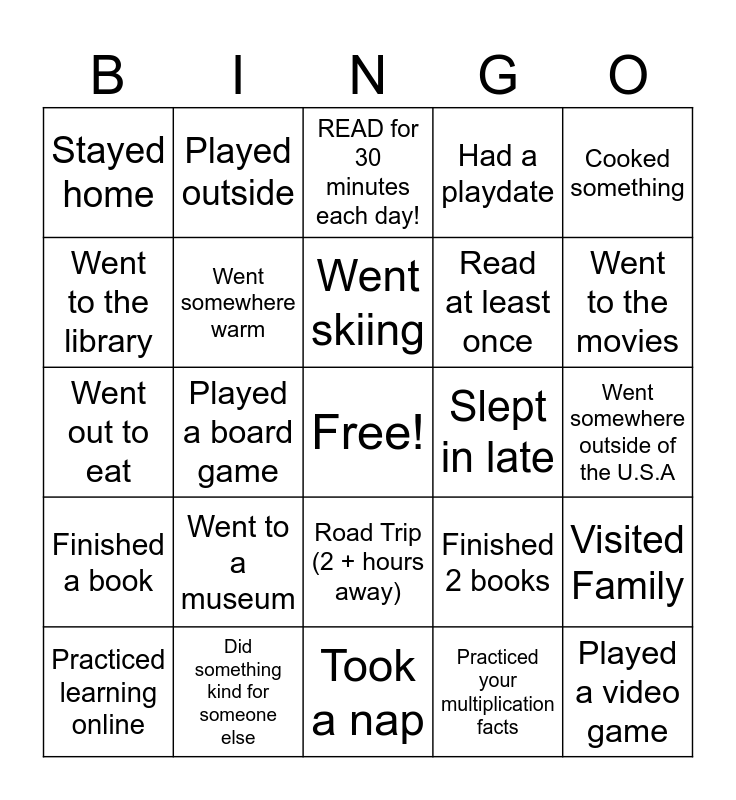 This bingo card has a free space and 24 words: Went to a museum, Did something kind for someone else, Went skiing, Practiced learning online, Cooked something, Stayed home, Went to the library, Played outside, Slept in late, Road Trip (2 + hours away), Read at least once, Went out to eat, Finished 2 books, Visited Family, Went somewhere warm, Practiced your multiplication facts, Went somewhere outside of the U.S.A, READ for 30 minutes each day!, Went to the movies, Played a board game, Played a video game, Finished a book, Had a playdate and Took a nap.