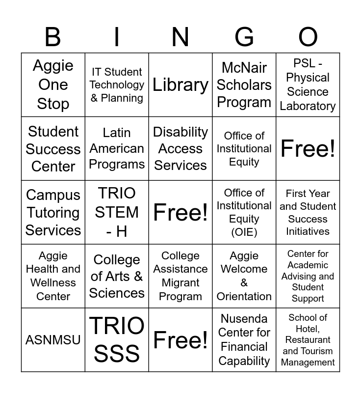 This bingo card has a free space and 24 words: College of Arts & Sciences, TRIO SSS, Disability Access Services, ASNMSU, PSL - Physical Science Laboratory, Aggie One Stop, Student Success Center, IT Student Technology & Planning, Office of Institutional Equity (OIE), College Assistance Migrant Program, Office of Institutional Equity, Campus Tutoring Services, Aggie Welcome & Orientation, Center for Academic Advising and Student Support, Latin American Programs, Nusenda Center for Financial Capability, First Year and Student Success Initiatives, Library, Free!, TRIO STEM - H, School of Hotel, Restaurant and Tourism Management, Aggie Health and Wellness Center, McNair Scholars Program and Free!.
