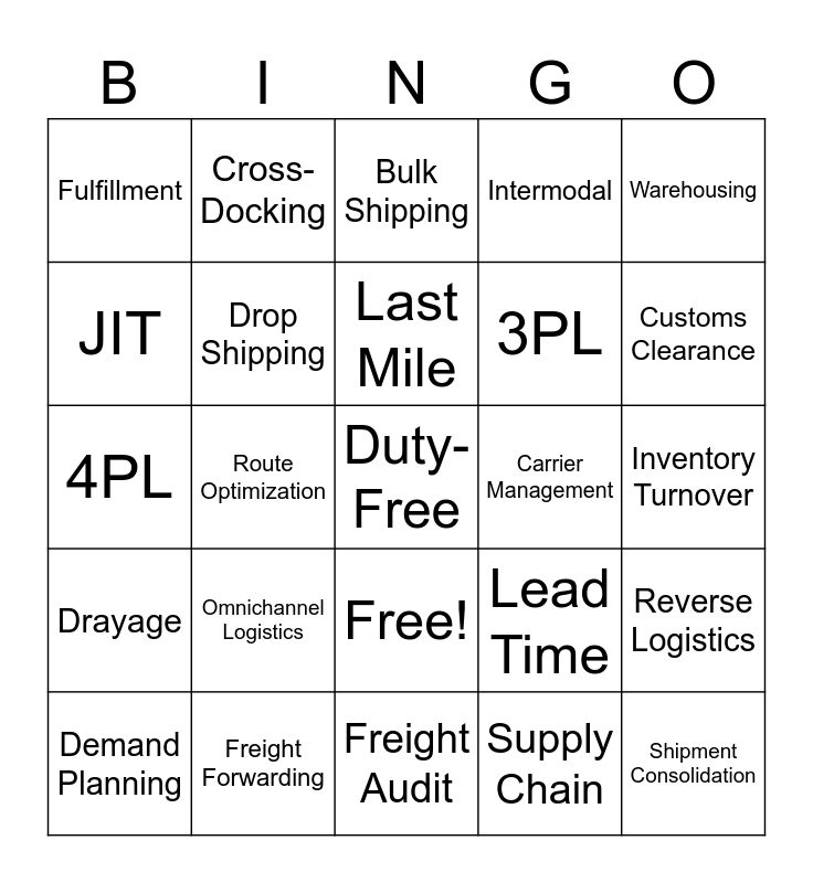 This bingo card has 26 words: Free!, Supply Chain, Last Mile, Freight Forwarding, Warehousing, Fulfillment, JIT, Cross-Docking, Inventory Turnover, Lead Time, 3PL, 4PL, Reverse Logistics, Demand Planning, Route Optimization, Cold Chain, Intermodal, Drayage, Bulk Shipping, Duty-Free, Customs Clearance, Freight Audit, Carrier Management, Omnichannel Logistics, Drop Shipping and Shipment Consolidation.