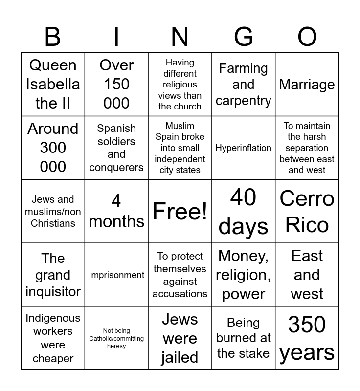 This bingo card has a free space and 24 words: Imprisonment, Not being Catholic/committing heresy, Muslim Spain broke into small independent city states, Indigenous workers were cheaper, Marriage, Queen Isabella the II, Around 300 000, Over 150 000, 40 days, To protect themselves against accusations, Hyperinflation, Jews and muslims/non Christians, Money, religion, power, East and west, Spanish soldiers and conquerers, Being burned at the stake, Cerro Rico, Having different religious views than the church, To maintain the harsh separation between east and west, 4 months, 350 years, The grand inquisitor, Farming and carpentry and Jews were jailed.