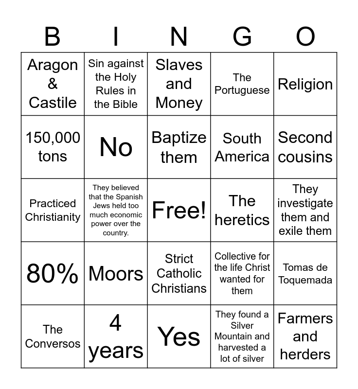 This bingo card has a free space and 24 words: Moors, 4 years, Baptize them, The Conversos, Religion, Aragon & Castile, 150,000 tons, Sin against the Holy Rules in the Bible, The heretics, Strict Catholic Christians, South America, Practiced Christianity, Collective for the life Christ wanted for them, Tomas de Toquemada, No, They found a Silver Mountain and harvested a lot of silver, They investigate them and exile them, Slaves and Money, Second cousins, They believed that the Spanish Jews held too much economic power over the country., Farmers and herders, 80%, The Portuguese and Yes.