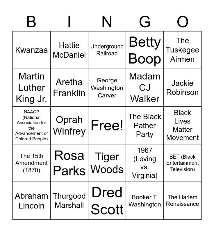 This bingo card has a free space and 25 words: Rosa Parks, Dred Scott, George Washington Carver, Abraham Lincoln, The Tuskegee Airmen, Kwanzaa, Martin Luther King Jr., Hattie McDaniel, The Black Pather Party, Tiger Woods, Madam CJ Walker, NAACP (National Association for the Advancement of Colored People), 1967 (Loving vs. Virginia), BET (Black Entertainment Television), Aretha Franklin, Jim Crow Laws, Black Lives Matter Movement, Underground Railroad, Jackie Robinson, Oprah Winfrey, The Harlem Renaissance, Thurgood Marshall, The 15th Amendment (1870), Betty Boop and Booker T. Washington.