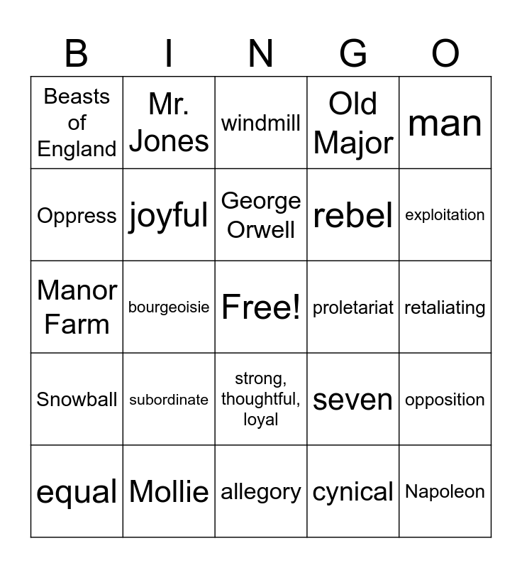 This bingo card has a free space and 24 words: subordinate, Mollie, George Orwell, equal, man, Beasts of England, Oppress, Mr. Jones, proletariat, strong, thoughtful, loyal, rebel, Manor Farm, seven, opposition, joyful, cynical, retaliating, windmill, exploitation, bourgeoisie, Napoleon, Snowball, Old Major and allegory.