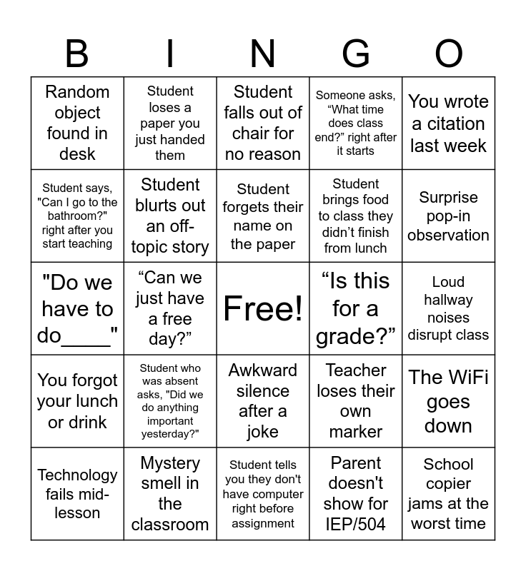 This bingo card has a free space and 24 words: Student who was absent asks, "Did we do anything important yesterday?", Mystery smell in the classroom, Student forgets their name on the paper, Technology fails mid-lesson, You wrote a citation last week, Random object found in desk, Student says, "Can I go to the bathroom?" right after you start teaching, Student loses a paper you just handed them, “Is this for a grade?”, Awkward silence after a joke, Student brings food to class they didn’t finish from lunch, "Do we have to do____", Teacher loses their own marker, The WiFi goes down, Student blurts out an off-topic story, Parent doesn't show for IEP/504, Loud hallway noises disrupt class, Student falls out of chair for no reason, Surprise pop-in observation, “Can we just have a free day?”, School copier jams at the worst time, You forgot your lunch or drink, Someone asks, “What time does class end?” right after it starts and Student tells you they don't have computer right before assignment.