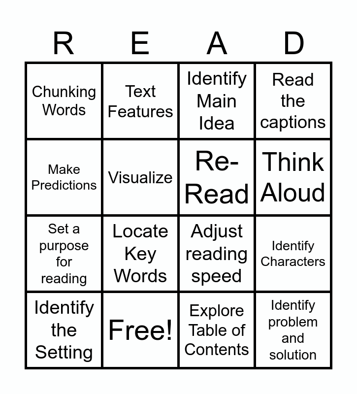 This bingo card has 25 words: Activate Prior Knowledge, Use Context Clues, Think Aloud, Summarize the text, Make Predictions, Chunking Words, Visualize, Text Features, Free!, Make Connections, Set a purpose for reading, Adjust reading speed, Inferring, Questioning, Re-Read, Picture Walk, Explore Table of Contents, Identify Main Idea, Locate Key Words, Identify Characters, Identify the Setting, Read Bold Words, Identify problem and solution, Read the captions and Read Subheadings.