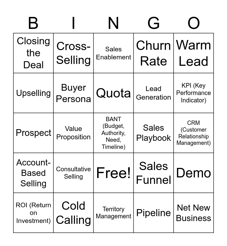 This bingo card has 26 words: Free!, Pipeline, Quota, Cold Calling, Warm Lead, Closing the Deal, Upselling, Cross-Selling, CRM (Customer Relationship Management), Sales Funnel, Lead Generation, Prospect, Demo, ROI (Return on Investment), Value Proposition, Objection Handling, Churn Rate, Account-Based Selling, Sales Enablement, BANT (Budget, Authority, Need, Timeline), KPI (Key Performance Indicator), Territory Management, Sales Playbook, Consultative Selling, Buyer Persona and Net New Business.