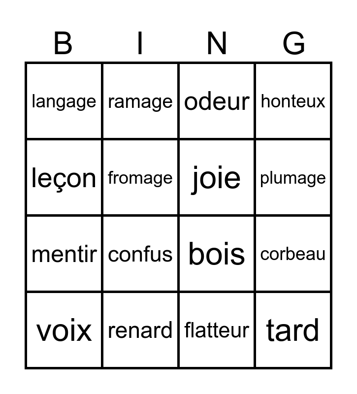 This bingo card has 16 words: renard, corbeau, odeur, langage, mentir, ramage, bois, flatteur, leçon, fromage, voix, honteux, confus, plumage, joie and tard.