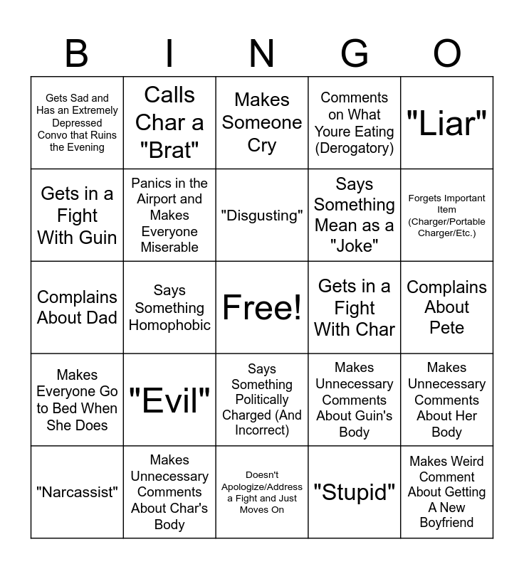 This bingo card has a free space and 24 words: "Narcassist", "Evil", "Disgusting", "Stupid", "Liar", Gets Sad and Has an Extremely Depressed Convo that Ruins the Evening, Calls Char a "Brat", Makes Someone Cry, Gets in a Fight With Char, Complains About Pete, Complains About Dad, Panics in the Airport and Makes Everyone Miserable, Makes Unnecessary Comments About Guin's Body, Makes Unnecessary Comments About Her Body, Gets in a Fight With Guin, Makes Unnecessary Comments About Char's Body, Doesn't Apologize/Address a Fight and Just Moves On, Comments on What Youre Eating (Derogatory), Forgets Important Item (Charger/Portable Charger/Etc.), Makes Everyone Go to Bed When She Does, Says Something Homophobic, Says Something Politically Charged (And Incorrect), Says Something Mean as a "Joke" and Makes Weird Comment About Getting A New Boyfriend.