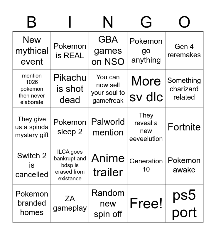 This bingo card has 30 words: ZA gameplay, Black and white remakes, Pokemon sleep 2, TCG pocket expansion announcement, New mythical event, GBA games on NSO, Pikachu is shot dead, Anime trailer, They reveal a new eeveelution, Random new spin off, Fortnite, Palworld mention, Free!, ps5 port, Something charizard related, Detective pikachu 2 (the movie), Generation 10, Switch 2 is cancelled, ILCA goes bankrupt and bdsp is erased from existance, Gen 4 reremakes, They give us a spinda mystery gift, Celebi for the fiftieth time, Pokemon is REAL, More sv dlc, mention 1026 pokemon then never elaborate, Pokemon go anything, Pokemon awake, Pokemon branded homes, You can now sell your soul to gamefreak and Random things show up that mean nothing.