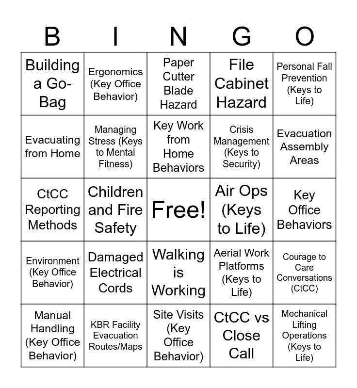 This bingo card has a free space and 88 words: 10th Anniversary of Zero Harm, Journey to Zero Harm, Walking is Working, Walking Hazards, Housekeeping Hazards, Poor Walking/Damaged Surfaces, Distracted Walking, Hand Safety, Preventing Hand Injuries in the Kitchen, Preventing Hand Injuries in the Yard, Preventing Hand Injuries in the Gym, Preventing Hand Injuries - Home Improvement, Courage to Care Conversations (CtCC), Key Office Behaviors, Key Pandemic Behaviors, Key Work from Home Behaviors, Keys to Life, Keys to Mental Fitness, Keys to Security, Field CtCC, Office CtCC, Home & Play CtCC, CtCC Reporting Methods, CtCC Web App, CtCC vs Close Call, Stop Work Authority (SWA), Identifying Hazards, Improper Use of a Ladder, Improper Footwear, Using the Wrong Tool for the Job, Paper Cutter Blade Hazard, File Cabinet Hazard, Daisy Chaining, Blocked Emergency Exit Hazard, Damaged Electrical Cords, Evacuating from Home, Building a Go-Bag, Home Fire Escape Plan, Home Fire Drill, Evacuation Assembly Areas, Children and Fire Safety, HSSE Team POCs, Access Control (Keys to Security), Aerial Work Platforms (Keys to Life), Air Ops (Keys to Life), Communication (Key Work From Home Behaviors), Compartmentalization (Keys to Security), Confined Space (Keys to Life), Creating Change (Keys to Mental Fitness), Crisis Management (Keys to Security), Critical Assets Management (Keys to Security), Driving (Key Office Behavior), Eating Better (Keys to Mental Fitness), Emergency Arrangements (Key Office Behavior), Energy Isolation (Keys to Life), Enhancing Focus (Keys to Mental Fitness), Environment (Key Office Behavior), Ergonomics (Key Office Behavior), Falling Objects (Keys to Life), Finding Meaning (Keys to Mental Fitness), Getting Help (Keys to Mental Fitness), Ground Disturbance (Keys to Life), Health (Key Office Behavior), Home Security (Key Work From Home Behaviors), Information Security (Keys to Security), KBR Facility Evacuation Routes/Maps, Local Emergency Response Plan (LERP), Managing Stress (Keys to Mental Fitness), Manual Handling (Key Office Behavior), Mechanical Lifting Operations (Keys to Life), Mental Health (Key Work From Home Behaviors), Mobile Equipment (Keys to Life), Moving Better (Keys to Mental Fitness), Personal Fall Prevention (Keys to Life), Reconnecting (Keys to Mental Fitness), Report Security Incidents (Keys to Security), Security Emergency Response Plans (Keys to Security), See Something Say Something (Keys to Security), Site Visits (Key Office Behavior), Situational Awareness (Key Office Behavior), Sleeping Better (Keys to Mental Fitness), Social Media (Keys to Security), Stairs/Escalator (Key Office Behavior), Travel Security (Keys to Security), Vehicle Operations (Keys to Life), Work Structure (Key Work From Home Behaviors), Workstation Arrangement (Key Work From Home Behaviors) and Contact Points (Key Pandemic Behaviors).