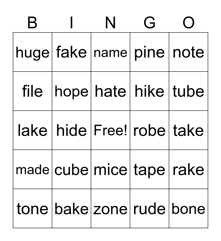 This bingo card has a free space and 36 words: cape, bike, cake, hope, tape, made, hate, bite, note, fine, hide, pine, rode, robe, tube, huge, cute, cube, bone, name, take, rake, bake, tone, zone, fake, lake, like, hike, file, mile, pole, rude, mice, five and late.