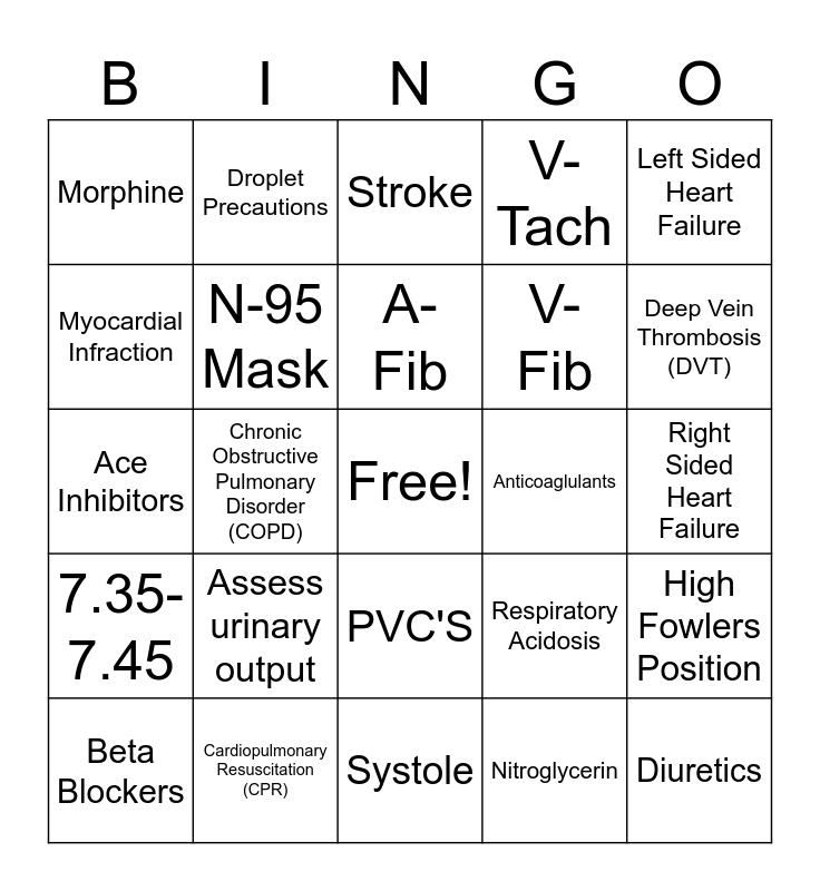 This bingo card has a free space and 24 words: Assess urinary output, Cardiopulmonary Resuscitation (CPR), A-Fib, Beta Blockers, Left Sided Heart Failure, Morphine, Myocardial Infraction, Droplet Precautions, Anticoaglulants, PVC'S, V-Fib, Ace Inhibitors, Respiratory Acidosis, High Fowlers Position, N-95 Mask, Nitroglycerin, Right Sided Heart Failure, Stroke, Deep Vein Thrombosis (DVT), Chronic Obstructive Pulmonary Disorder (COPD), Diuretics, 7.35-7.45, V-Tach and Systole.