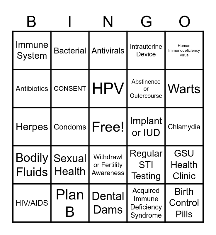 This bingo card has a free space and 25 words: Sexual Health, Dental Dams, HPV, HIV/AIDS, Human Immunodeficiency Virus, Immune System, Antibiotics, Bacterial, Implant or IUD, Withdrawl or Fertility Awareness, Abstinence or Outercourse, Herpes, Regular STI Testing, GSU Health Clinic, CONSENT, PrEP, Chlamydia, Antivirals, Warts, Condoms, Birth Control Pills, Plan B, Bodily Fluids, Intrauterine Device and Acquired Immune Deficiency Syndrome.