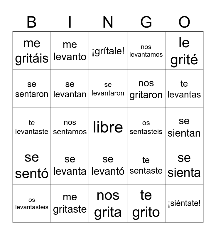 This bingo card has a free space and 39 words: me siento, me senté, te sientas, te sentaste, se sienta, se sentó, nos sentamos, os sentáis, os sentasteis, se sientan, se sentaron, me levanto, me levanté, te levantas, te levantaste, se levanta, se levantó, nos levantamos, os levantáis, os levantasteis, se levantan, se levantaron, te grito, le grité, les gritas, me gritaste, nos grita, os gritó, les gritamos, me gritáis, les gritasteis, me gritan, nos gritaron, ¡siéntate!, ¡levántate!, ¡siéntense!, ¡grítale!, ¡levántense! and ¡grítame!.