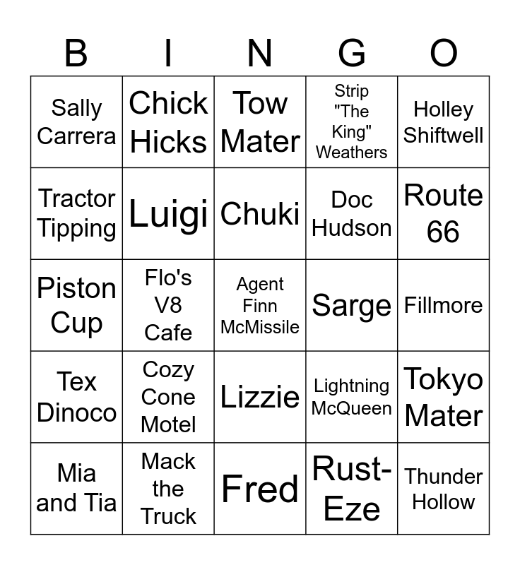 This bingo card has a free space and 27 words: Lightning McQueen, Ka-Chow!, Doc Hudson, Fred, Tractor Tipping, Tow Mater, Chick Hicks, Tex Dinoco, Sarge, Tokyo Mater, Piston Cup, Strip "The King" Weathers, Mia and Tia, Mack the Truck, Route 66, Radiator Springs, Luigi, Chuki, Cozy Cone Motel, Sally Carrera, Fillmore, Rust-Eze, Flo's V8 Cafe, Thunder Hollow, Lizzie, Holley Shiftwell and Ramone.