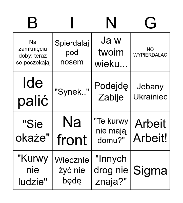 This bingo card has 16 words: Wiecznie żyć nie będę, Arbeit Arbeit!, Ja w twoim wieku..., Na zamknięciu doby: teraz se poczekają, "Sie okaże", Spierdalaj pod nosem, "Te kurwy nie mają domu?", "Innych drog nie znaja?", Ide palić, "Synek..", "Kurwy nie ludzie", NO WYPIERDALAC, Na front, Jebany Ukrainiec, Podejdę Zabije and Sigma.