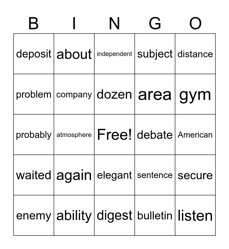 This bingo card has a free space and 24 words: again, ability, dozen, enemy, distance, deposit, problem, about, debate, elegant, area, probably, sentence, secure, company, bulletin, American, independent, gym, atmosphere, listen, waited, subject and digest.