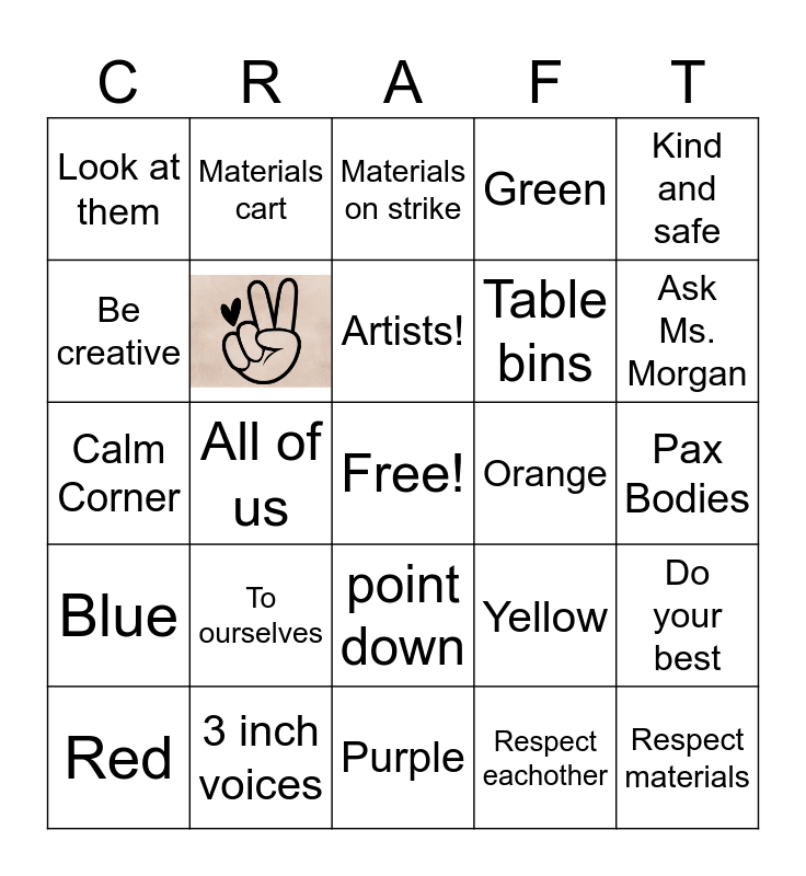 This bingo card has 1 images, a free space and 28 words: Red, Click, All of us, One time, Look at them, Materials on strike, To ourselves, Orange, 3 inch voices, Pax Bodies, Respect materials, Purple, Respect eachother, Ask Ms. Morgan, 0 inch voices, point down, Blue, Kind and safe, Calm Corner, Yellow, No running, Table bins, Be creative, Green, Materials cart, Do your best, Artists! and Black.